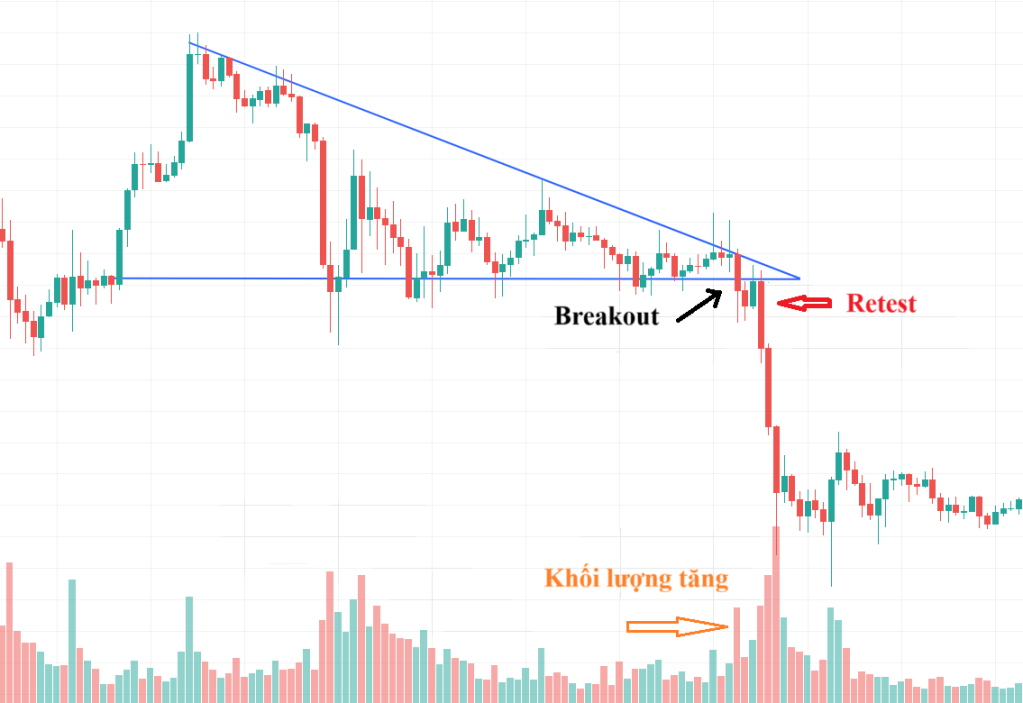 Khi giá phá vỡ đường hỗ trợ ngang kèm theo khối lượng giao dịch tăng mạnh, mô hình được xác nhận, báo hiệu một xu hướng giảm mạnh sắp xảy ra.