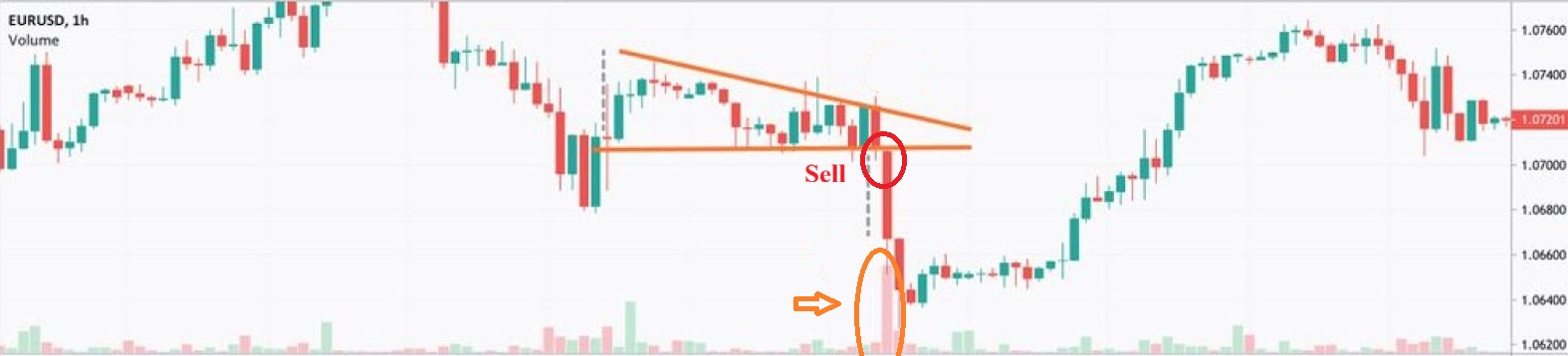 - Phá vỡ: Đây là khoảnh khắc phe bán cuối cùng đã chiến thắng. Lực bán áp đảo hoàn toàn phe mua, đẩy giá vượt qua ngưỡng hỗ trợ quan trọng. Khối lượng tăng đột biến xác nhận rằng nhiều nhà giao dịch đang bán tháo tài sản, tạo ra một đợt giảm giá mạnh mẽ tiếp theo.