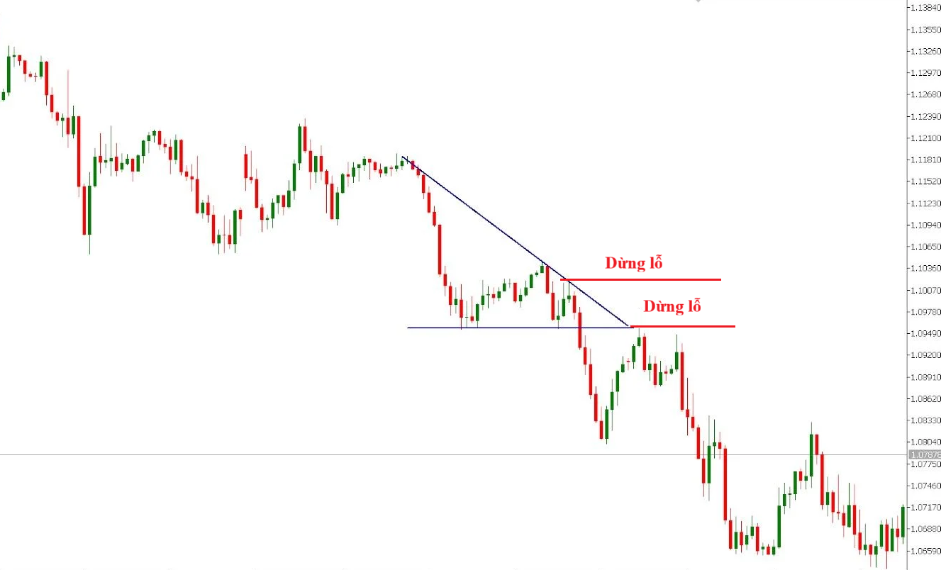 - Trên đường kháng cự dốc xuống một chút: Nếu bạn vào lệnh khi giá retest đường hỗ trợ và bật xuống từ đường kháng cự dốc xuống, bạn có thể đặt dừng lỗ ngay trên đường kháng cự dốc xuống một khoảng nhỏ.