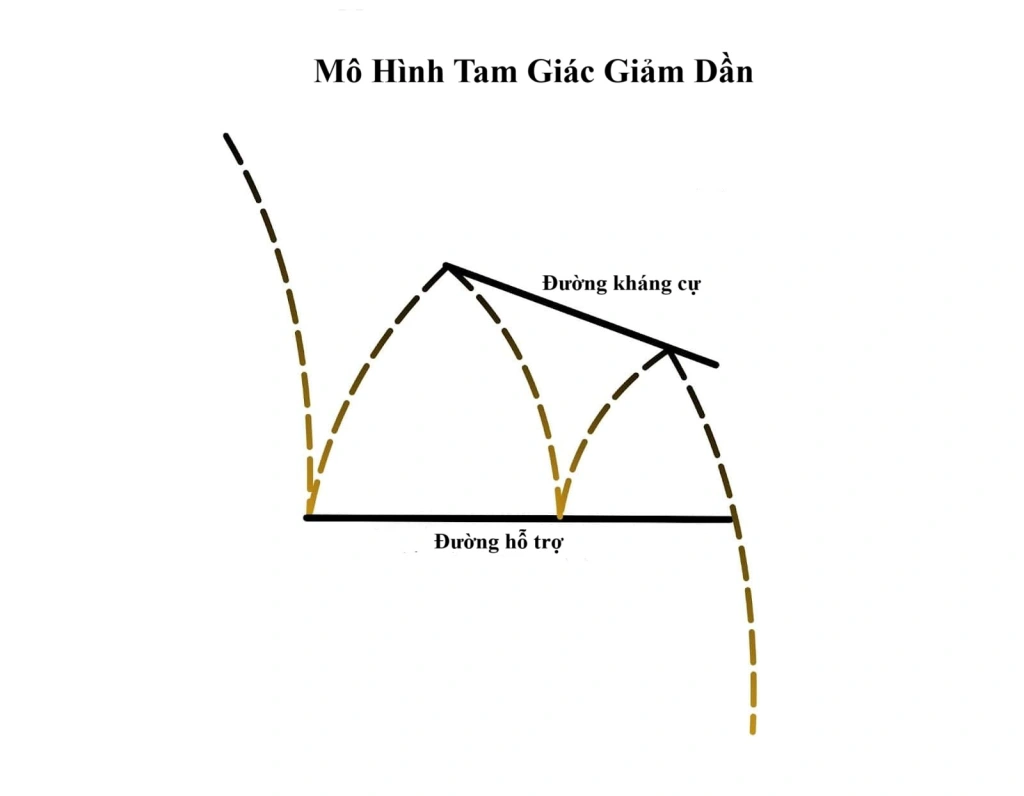 - Đường kháng cự giảm dần: Nối ít nhất hai đỉnh giá thấp dần, thể hiện áp lực bán ngày càng mạnh.