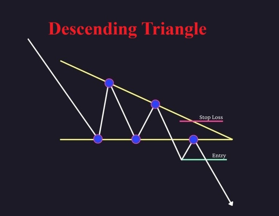 - Tín hiệu giảm giá: Mô hình này cho thấy phe bán đang chiếm ưu thế, với các đỉnh giá thấp dần, trong khi phe mua không thể đẩy giá vượt qua mức hỗ trợ.
