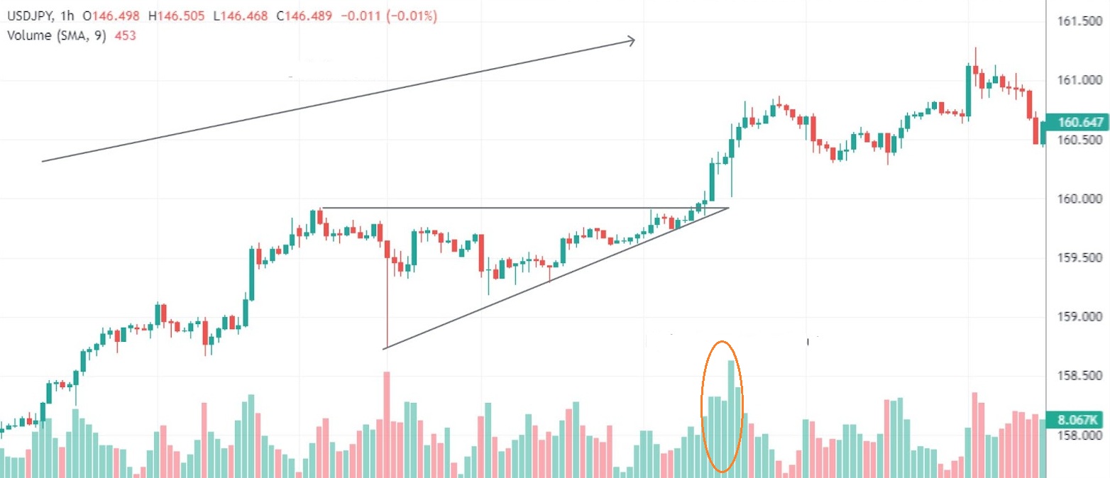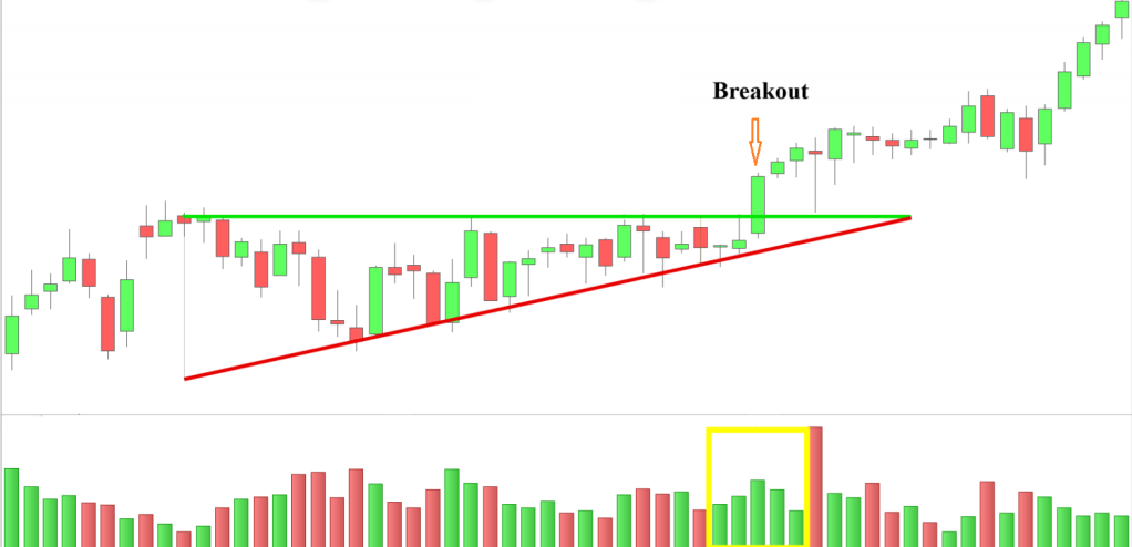 - Trong tam giác: Khối lượng giao dịch thường giảm dần, phản ánh giai đoạn tích lũy và sự do dự của thị trường.