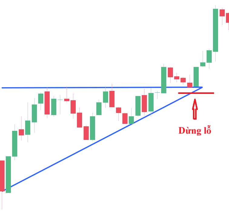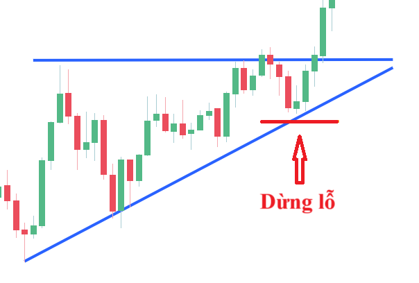 - Dưới đáy cuối cùng của mô hình: Một vị trí an toàn hơn là đặt dừng lỗ dưới đáy gần nhất trong cấu trúc tam giác. Nếu giá giảm xuống dưới mức này, mô hình có thể đã thất bại.
