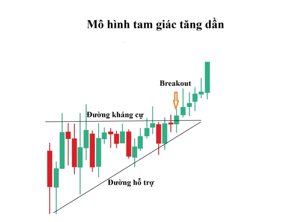 Mô hình tam giác tăng dần (Ascending Triangle Pattern) là một mô hình giá thuộc nhóm mô hình tam giác, thường xuất hiện trong xu hướng tăng hoặc giai đoạn tích lũy của thị trường. Mô hình này báo hiệu rằng giá có khả năng tiếp tục tăng sau khi phá vỡ vùng kháng cự, thể hiện sức mạnh của phe mua.