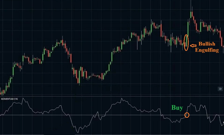 - Điều kiện cần: Thị trường trong xu hướng tăng. Momentum đã ở dưới ngưỡng 100 một khoảng thời gian đủ dài, sau đó cắt ngược lên trên.