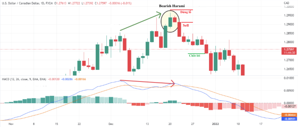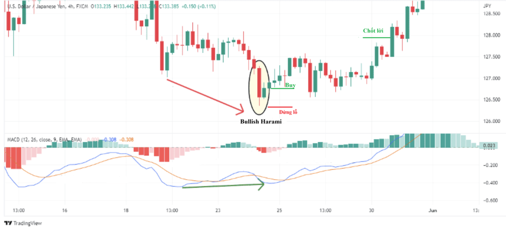 • Phân kỳ MACD: Nếu Harami xuất hiện cùng với phân kỳ MACD, đây là một xác nhận mạnh mẽ cho sự đảo chiều.