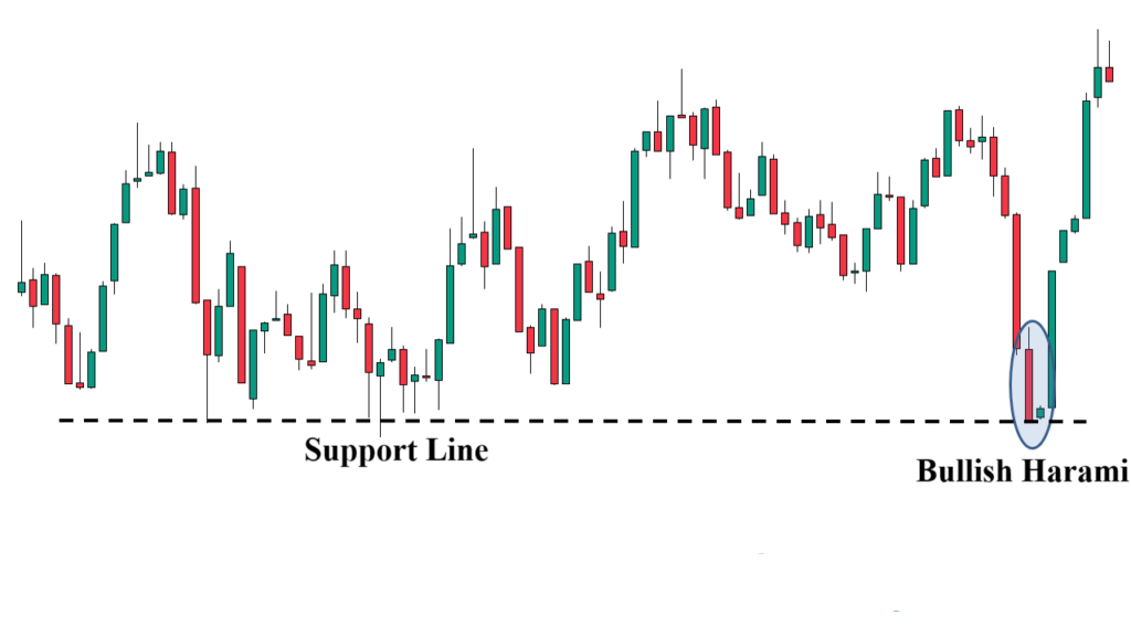 • Harami tăng tại vùng hỗ trợ: Khi một mô hình Harami tăng xuất hiện tại một vùng hỗ trợ mạnh, tín hiệu đảo chiều tăng sẽ đáng tin cậy hơn rất nhiều. Vùng hỗ trợ hoạt động như một bệ phóng cho sự đảo chiều.