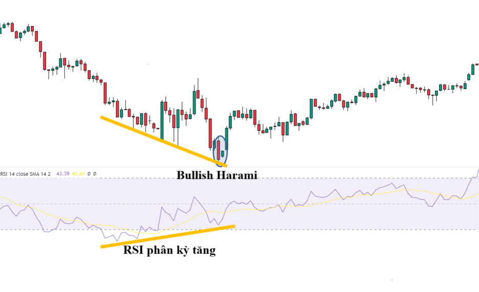 • Harami tăng và RSI quá bán: Khi Harami tăng xuất hiện trong vùng quá bán của RSI, điều này củng cố thêm tín hiệu đảo chiều tăng. Nó cho thấy thị trường đã bị bán quá mức và sắp sửa có sự điều chỉnh.
