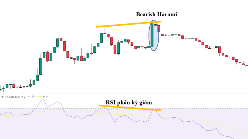 • Harami giảm và RSI quá mua: Khi Harami giảm xuất hiện trong vùng quá mua của RSI, điều này củng cố thêm tín hiệu đảo chiều giảm. Nó cho thấy thị trường đã bị mua quá mức và có thể đảo chiều giảm.