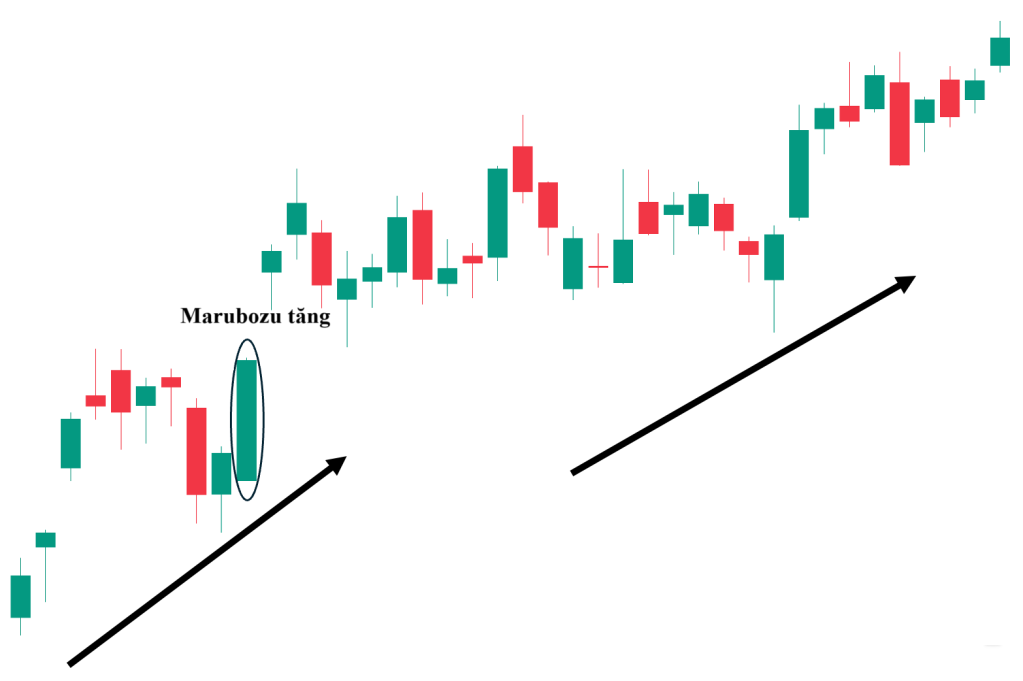 - Trong xu hướng tăng: Nếu Marubozu tăng giá xuất hiện, nó củng cố thêm sức mạnh cho xu hướng tăng.