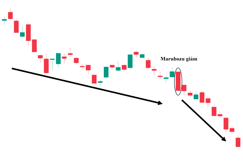 - Trong xu hướng giảm: Nếu Marubozu giảm giá xuất hiện, nó củng cố thêm sức mạnh cho xu hướng giảm.