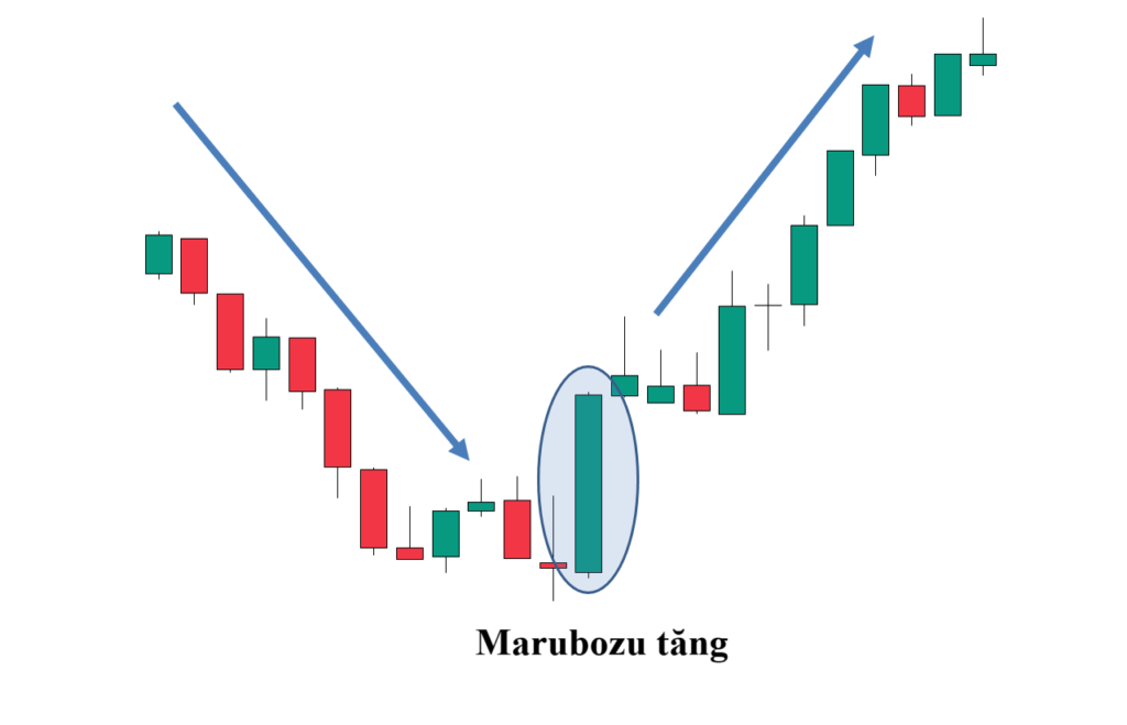 Tại đáy xu hướng giảm: Nếu Marubozu tăng giá xuất hiện, nó báo hiệu một sự đảo chiều tăng giá mạnh mẽ.
