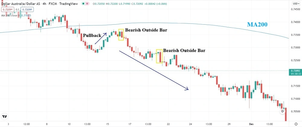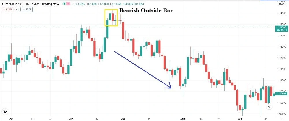 - Bearish Outside Bar: Đặt lệnh bán khi giá phá vỡ mức thấp nhất của nến Outside Bar.