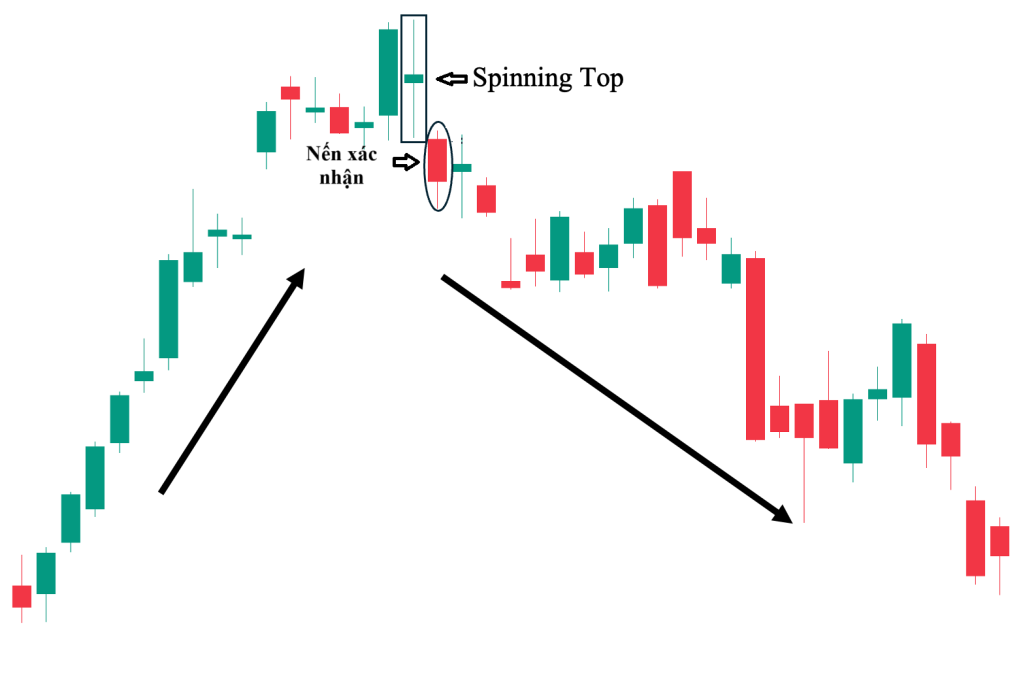 - Sau một xu hướng tăng mạnh: Nếu nến Spinning Top xuất hiện ở đỉnh xu hướng, đó có thể là dấu hiệu lực mua đang yếu dần và phe bán đang bắt đầu kiểm soát lại. Đây là cảnh báo về khả năng đảo chiều giảm giá.