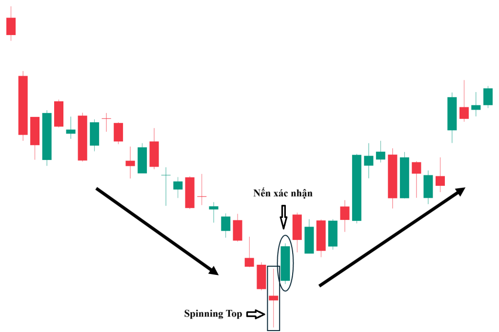 - Sau một xu hướng giảm mạnh: Ngược lại, nếu nến Spinning Top xuất hiện sau một loạt nến giảm dài, thân lớn, điều đó có thể báo hiệu lực bán đang cạn kiệt và phe mua đang chuẩn bị đẩy giá lên. Đây là cảnh báo về khả năng đảo chiều tăng giá.