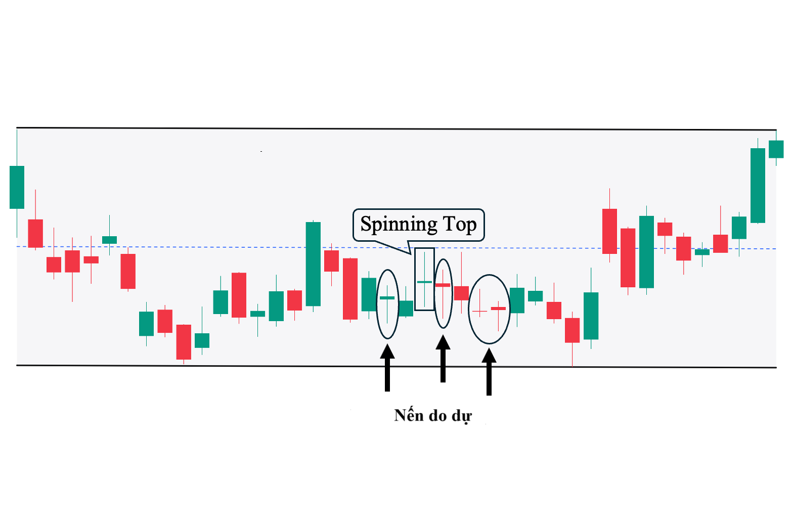 - Trong giai đoạn giá đi ngang: Nếu nến Spinning Top xuất hiện trong thị trường đi ngang, nó chỉ xác nhận rằng thị trường vẫn đang thiếu quyết đoán và không có xu hướng rõ ràng. Trong trường hợp này, nó ít có ý nghĩa dự báo đảo chiều.