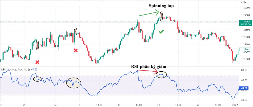 Chỉ báo dao động như RSI, Stochastic: Nếu nến Spinning Top xuất hiện khi chỉ báo RSI, Stochastic ở vùng quá mua hoặc quá bán và có sự phân kỳ giữa giá và chỉ báo, đây là một tín hiệu đảo chiều rất mạnh.