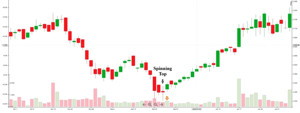 - Khối lượng giảm tại nến Spinning Top: Nếu khối lượng giao dịch giảm khi nến Spinning Top xuất hiện, điều này có thể củng cố ý nghĩa về sự yếu đi của xu hướng hiện tại.