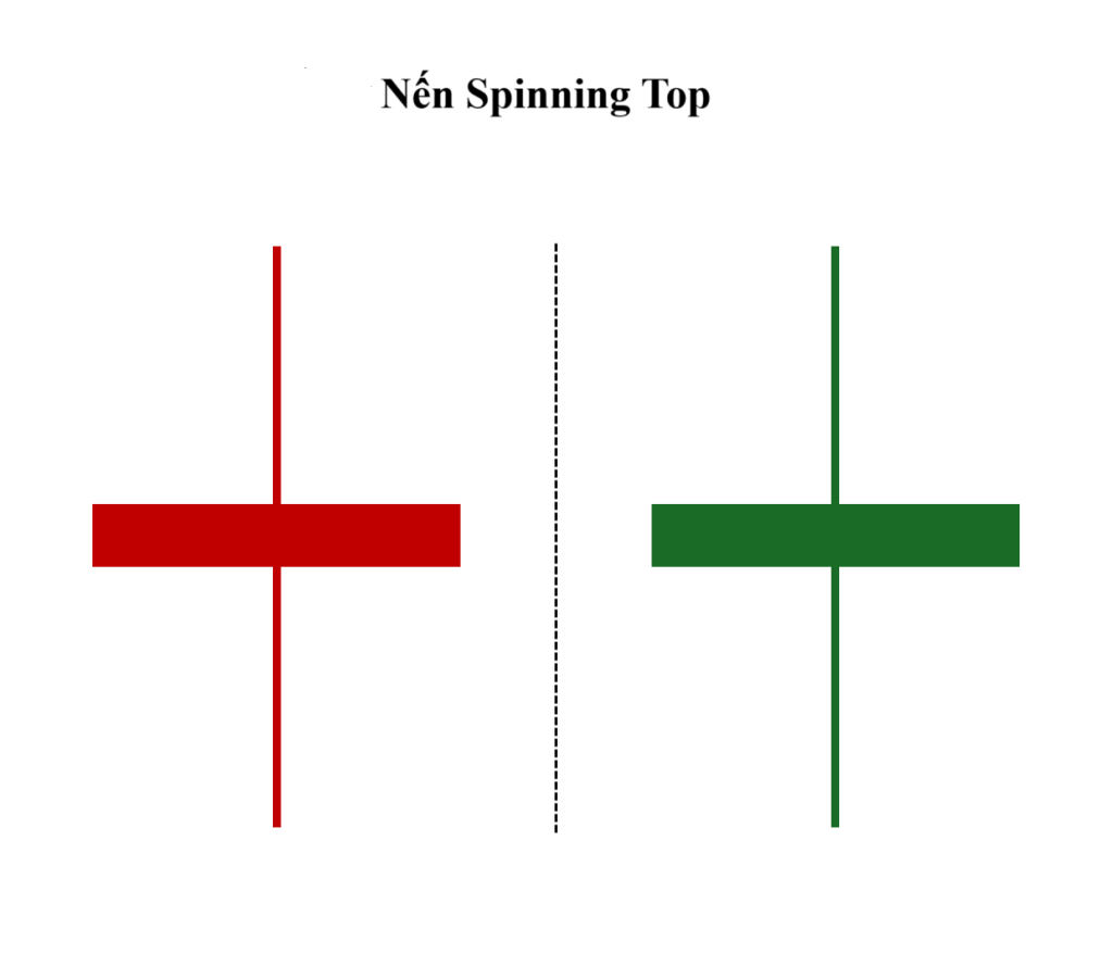 Nến Spinning Top là một dạng nến đơn trong phân tích kỹ thuật, nổi bật với thân nến nhỏ và hai bóng nến trên – dưới dài và gần bằng nhau. Thân nến nhỏ thể hiện sự chênh lệch rất ít giữa giá mở cửa và giá đóng cửa, bất kể đó là nến tăng hay nến giảm. Hình dáng của nến này giống như một con quay, phản ánh một trạng thái giằng co và do dự giữa phe mua và phe bán, khi không bên nào thực sự chiếm ưu thế.