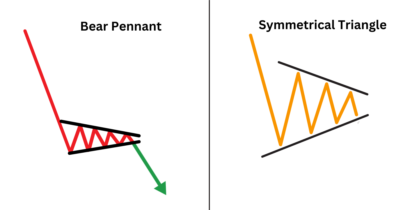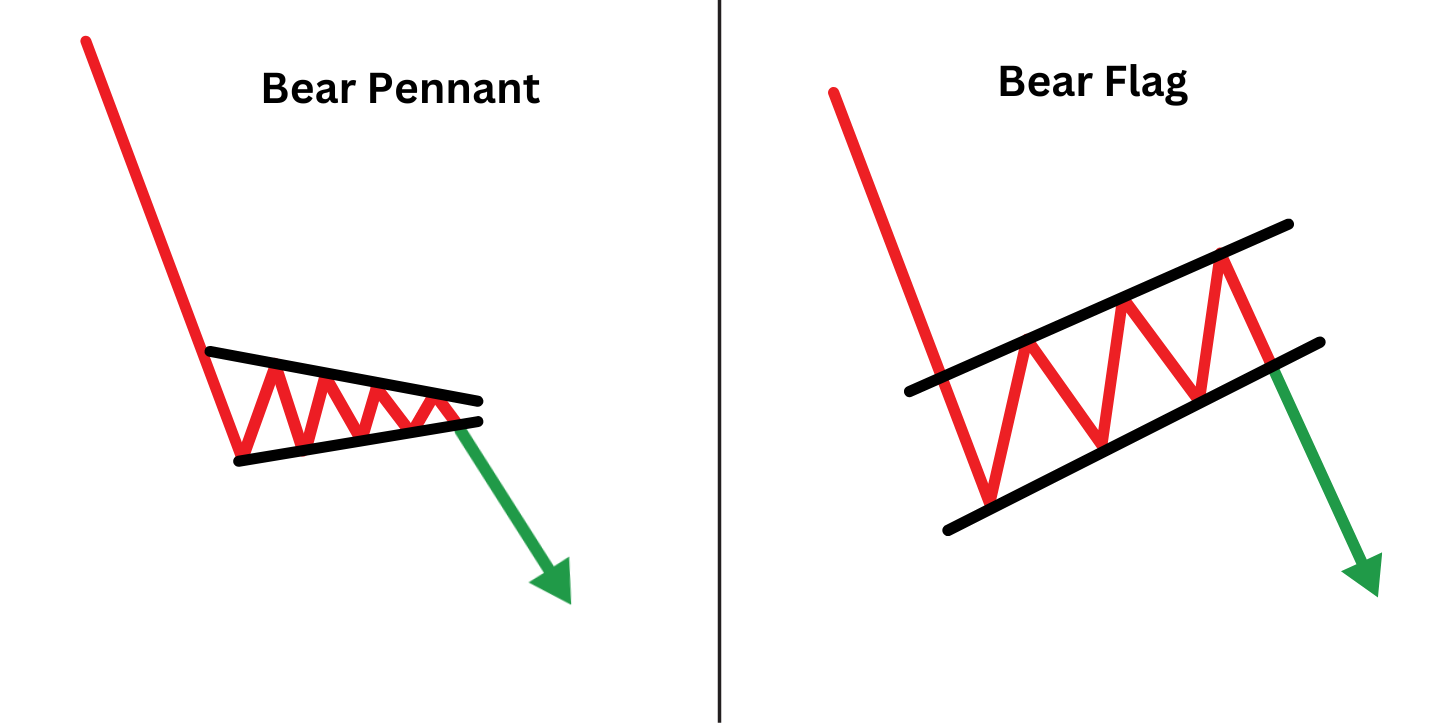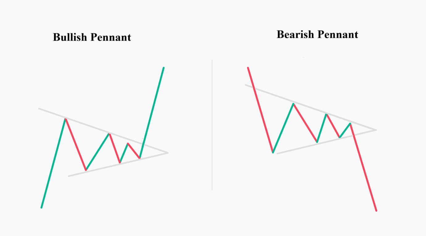 Bearish Pennant là phiên bản đối lập, xuất hiện trong xu hướng giảm mạnh. Sau khi giá lao xuống tạo cột cờ, thị trường bắt đầu dao động trong vùng tích lũy nhỏ. Phe mua nỗ lực phục hồi nhưng không đủ mạnh để đảo chiều, khiến biên độ giá ngày càng thu hẹp.