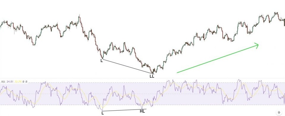 - Đặc điểm: Giá tạo đáy sau thấp hơn đáy trước, nhưng chỉ báo lại tạo đáy sau cao hơn đáy trước.
