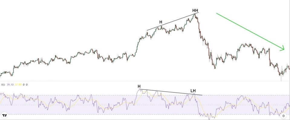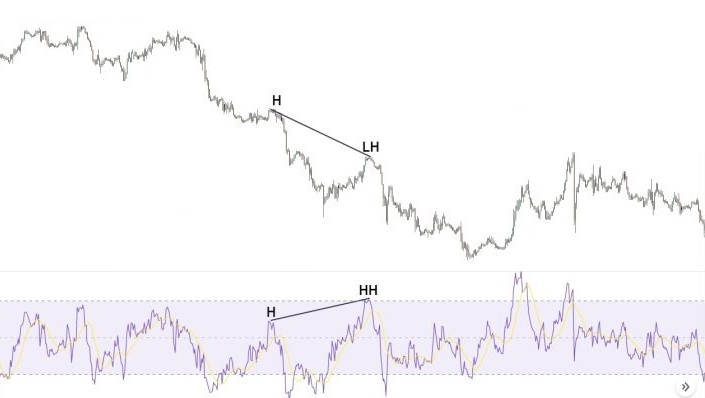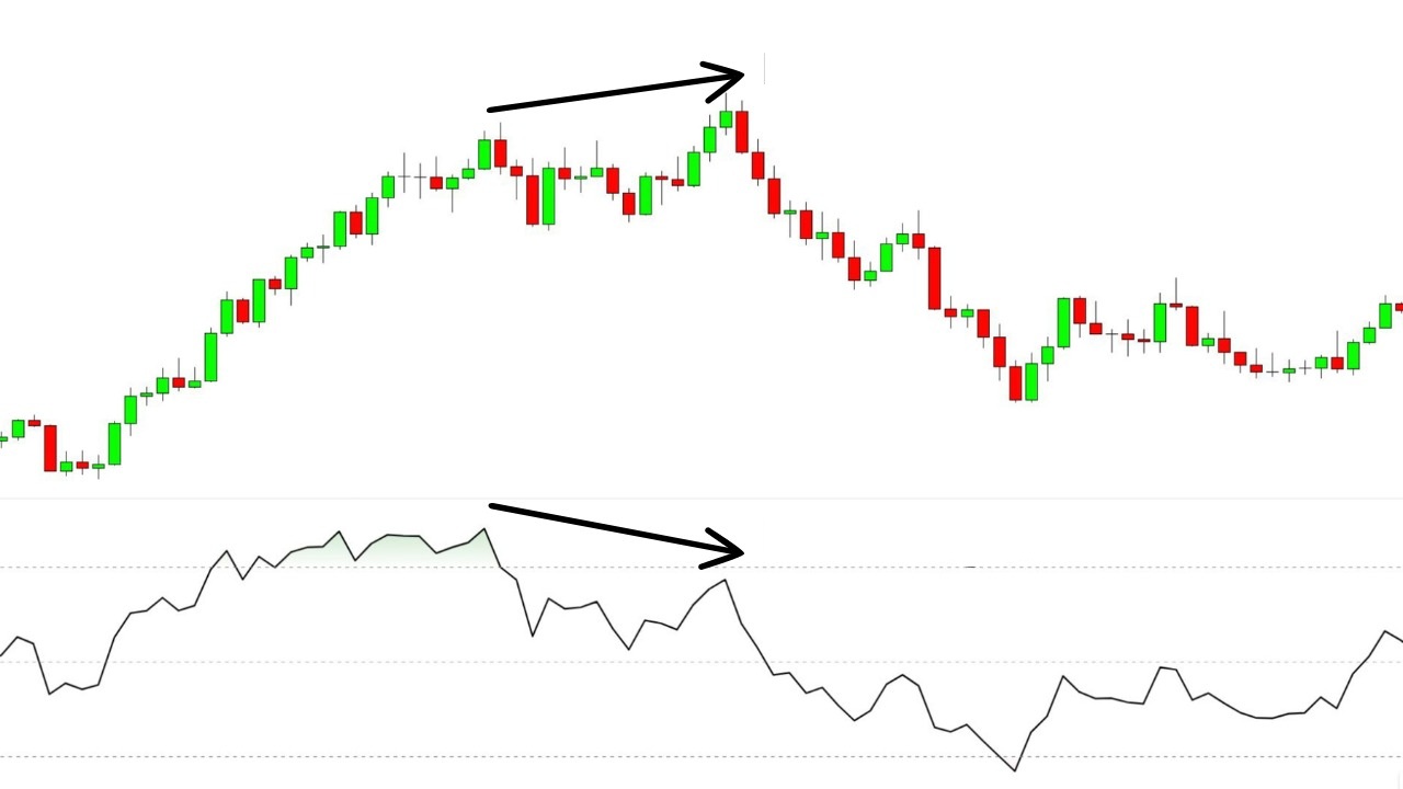 - Đặc điểm: Giá tạo đỉnh sau cao hơn đỉnh trước, nhưng chỉ báo lại tạo đỉnh sau thấp hơn đỉnh trước.