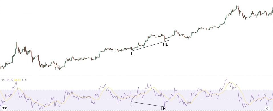 - Đặc điểm: Trong một xu hướng tăng, giá tạo đáy sau cao hơn đáy trước, nhưng chỉ báo lại tạo đáy sau thấp hơn đáy trước.