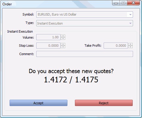 Requote (báo giá lại) là hiện tượng xảy ra khi nhà giao dịch đặt lệnh mua hoặc bán, nhưng thay vì được khớp ngay lập tức, nền tảng giao dịch gửi thông báo rằng mức giá bạn chọn không còn khả dụng và đề xuất một mức giá mới. Khi đó, bạn phải lựa chọn Accept – chấp nhận giá mới hoặc Cancel – hủy lệnh.