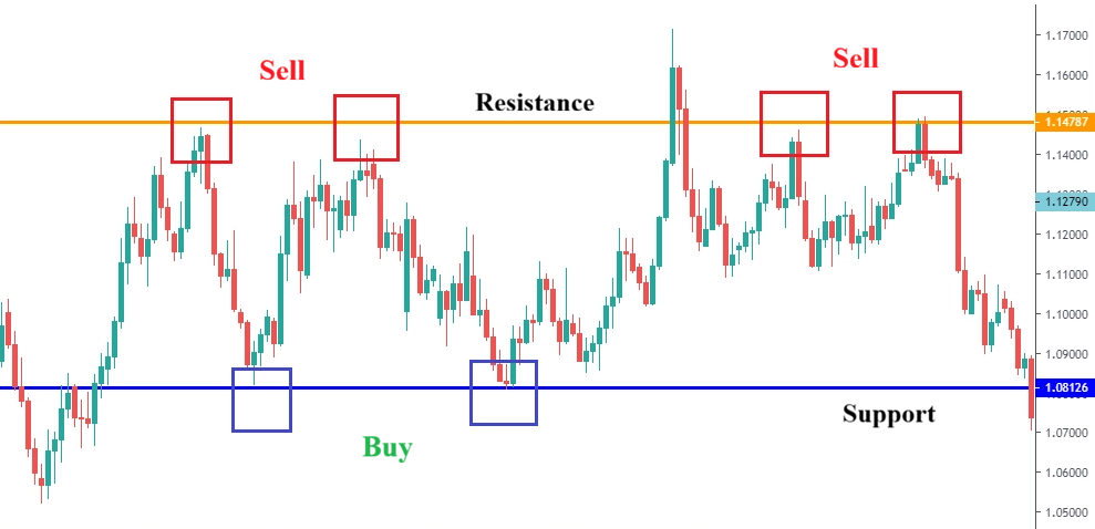Giao dịch theo phạm vi là chiến lược cơ bản và hiệu quả nhất khi thị trường sideway rõ ràng. Chiến lược này khai thác sự dao động qua lại của giá giữa hai vùng hỗ trợ và kháng cự.