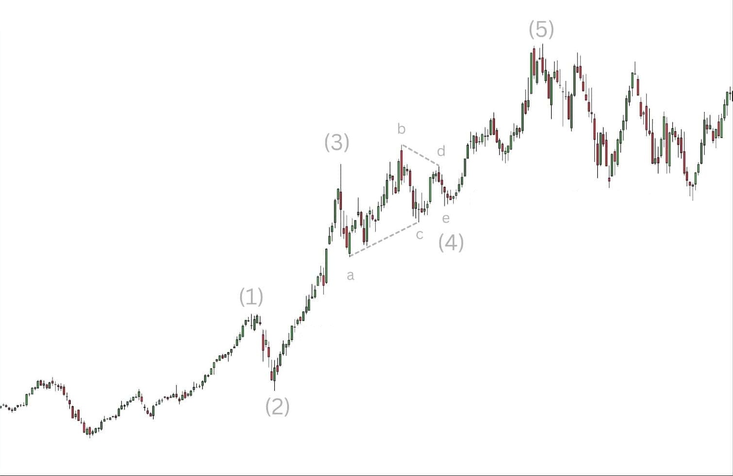 Sóng 5: Sóng cuối của xu hướng chính, thường đi kèm với sự lạc quan thái quá trong xu hướng tăng hoặc hoảng loạn trong xu hướng giảm. Tuy nhiên, động lượng của sóng 5 thường yếu hơn sóng 3.
