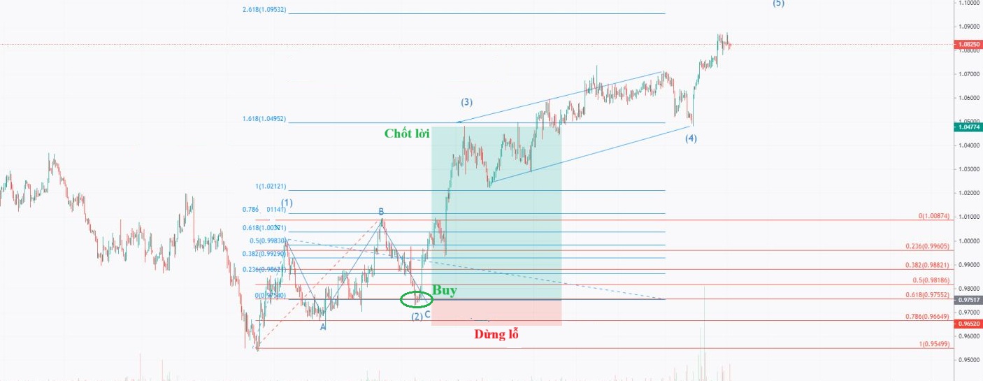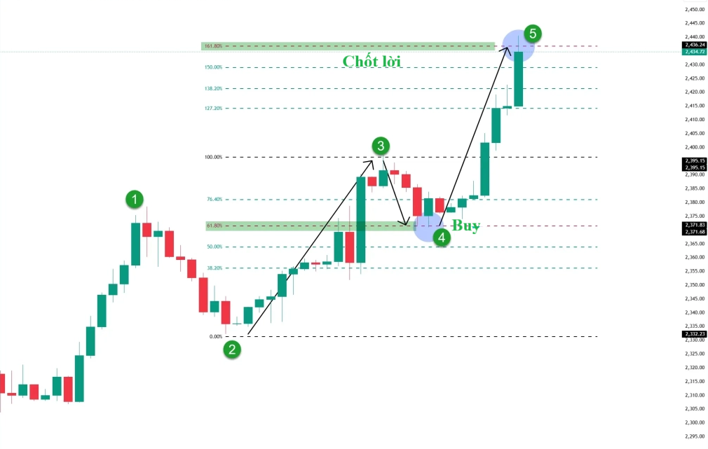 • Mở rộng: 161,8%, 261,8%, 423,6% cho sóng 3 và sóng 5.