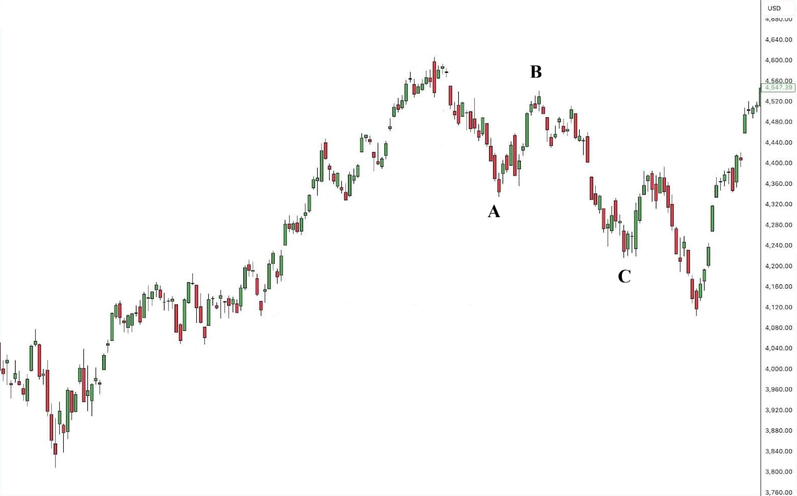Sóng C: Giá giảm mạnh, hoàn thành giai đoạn điều chỉnh. Sóng C thường có độ dài tương đương hoặc lớn hơn sóng A và có thể chạm các mức Fibonacci quan trọng.