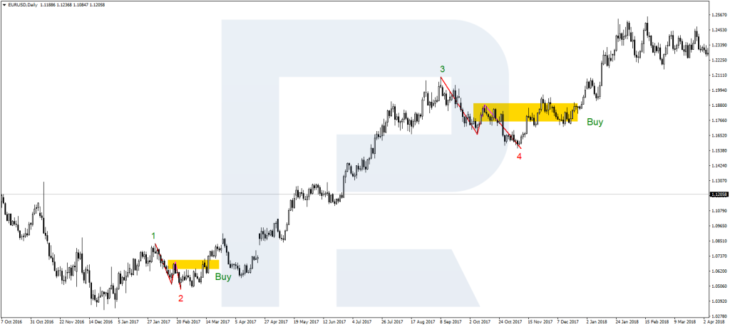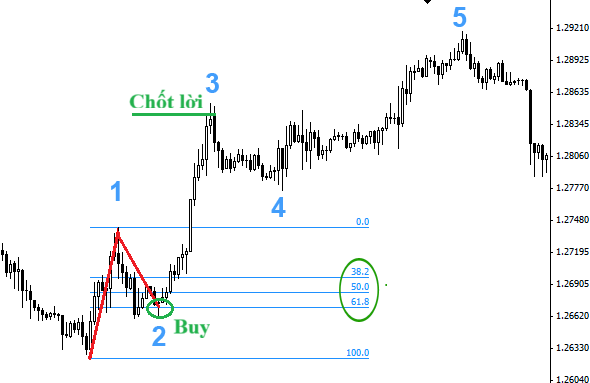 Sau khi sóng 1 hình thành và sóng 2 điều chỉnh về mức Fibonacci 50% hoặc 61,8%, chờ mô hình nến đảo chiều để vào lệnh mua. Đặt mục tiêu tại sóng 3.