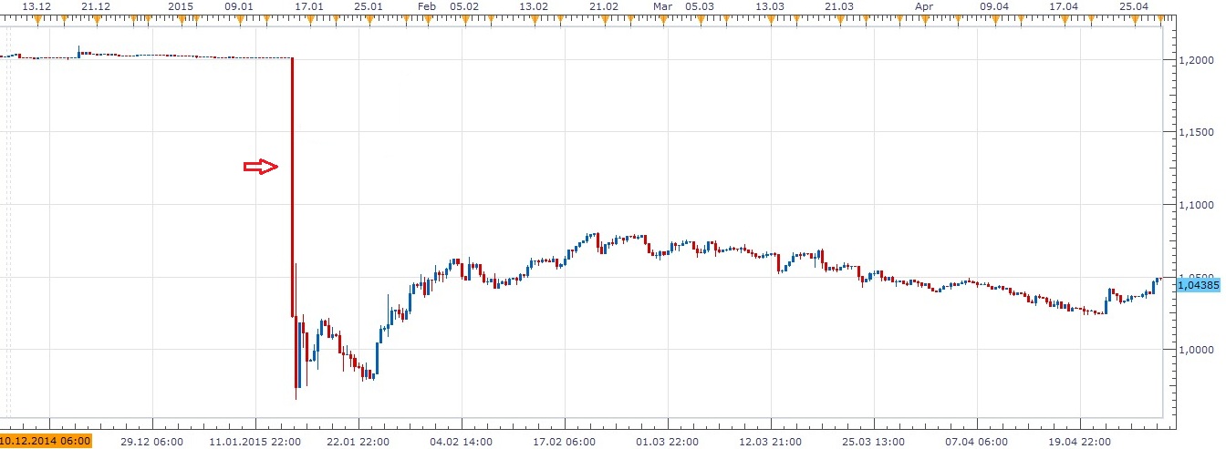 Ngày 15/01/2015, Ngân hàng Quốc gia Thụy Sĩ (SNB) bất ngờ hủy bỏ mức neo tỷ giá 1.20 của cặp EUR/CHF, quyết định này khiến thị trường rơi vào hỗn loạn khi cặp tiền giảm gần 3000 pip trong vài phút – một cú sập gần như chưa từng có trong lịch sử Forex.