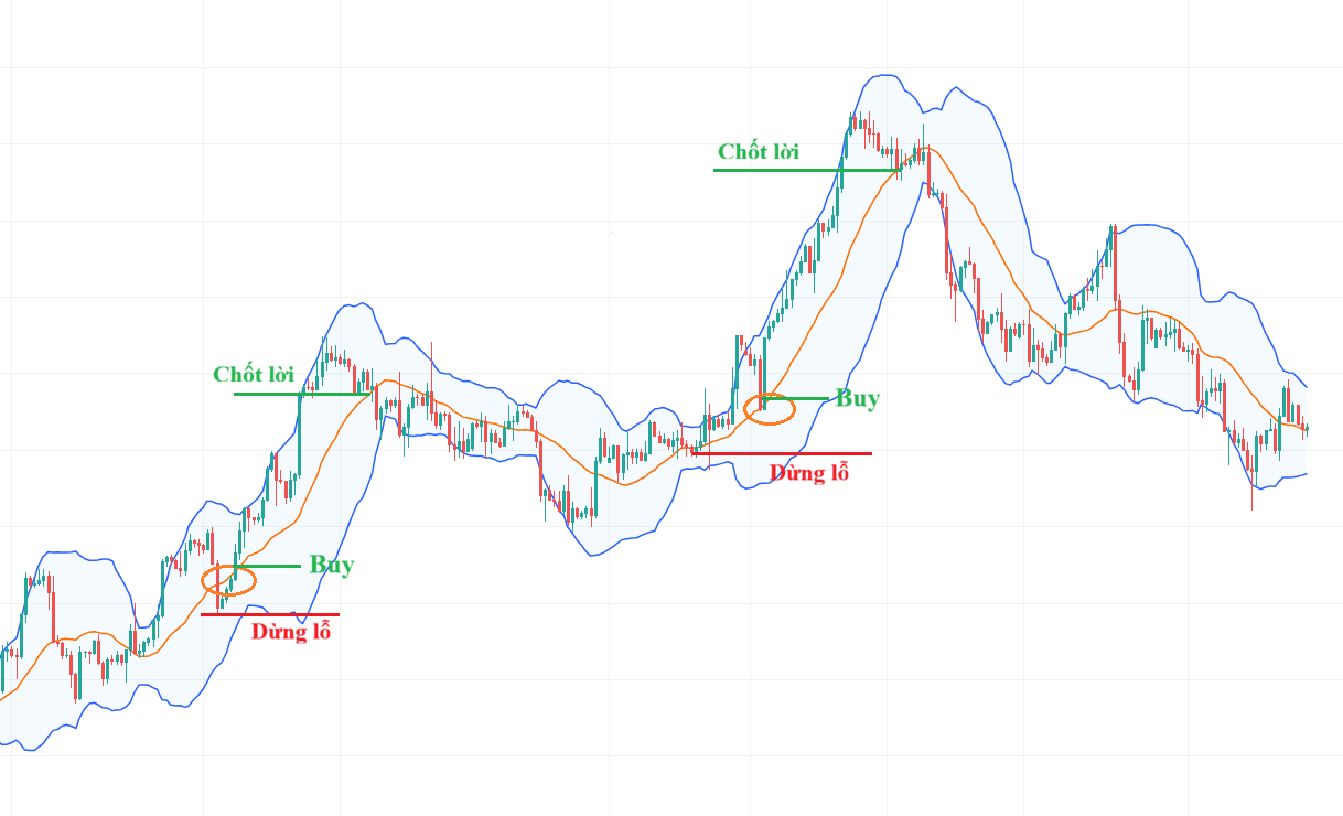 • Điểm dừng lỗ và chốt lời: Đặt dừng lỗ ở dưới dải biên dưới hoặc dưới đáy gần nhất. Chốt lời khi giá chạm dải trên một lần nữa hoặc khi dải BB có dấu hiệu co hẹp, báo hiệu sự kết thúc của một giai đoạn biến động mạnh.