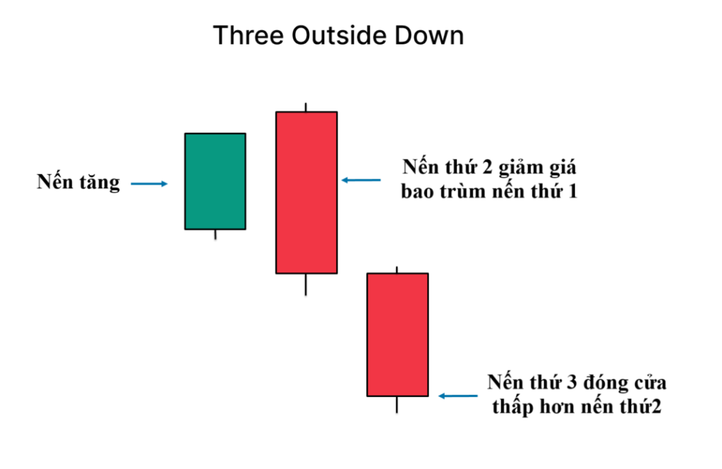 Mô hình nến Three Outside Down là một mô hình nến Nhật đảo chiều giảm xuất hiện ở cuối một xu hướng tăng, báo hiệu khả năng giá sẽ đảo chiều từ tăng sang giảm. Mô hình này bao gồm ba cây nến liên tiếp, thường xuất hiện ở đỉnh của một xu hướng tăng, cho thấy áp lực bán đang vượt qua áp lực mua, dẫn đến sự thay đổi trong tâm lý thị trường.