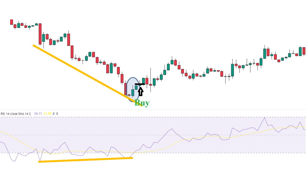 - RSI: Khi mô hình xuất hiện trong vùng quá bán hoặc chỉ báo RSI hình thành phân kỳ dương, đây được xem là tín hiệu củng cố cho khả năng đảo chiều tăng giá của thị trường.
