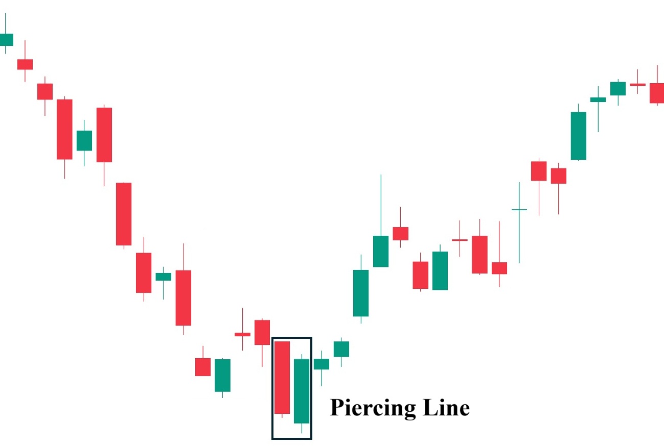 Gần giống với Bullish Engulfing nhưng nến thứ hai không bao phủ hoàn toàn nến trước đó. Piercing Line yêu cầu nến tăng thứ hai phải mở cửa gap down xuống dưới đáy nến trước và đóng cửa trên mức 50% của nến đỏ.
